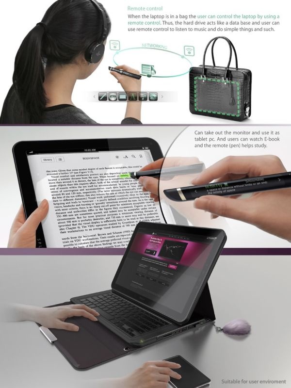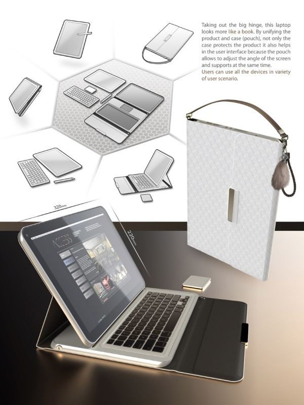 Дизайнер Дэй Хун Джун (Dae Hoon Jung) из Кореи предлагает еще один вариант того, как всколыхнуть изрядно уже застоявшееся болото ноутбуков. Идея автора такова: ноутбук Split выполняется не в единой конструкции, а из отдельных компонентов, которые подключаются друг к другу по беспроводному каналу. А хранится это все в изящной кожаной папке, которая может быть оформлена и в мужском, и в дамском стиле.