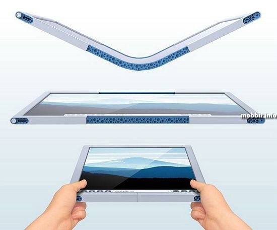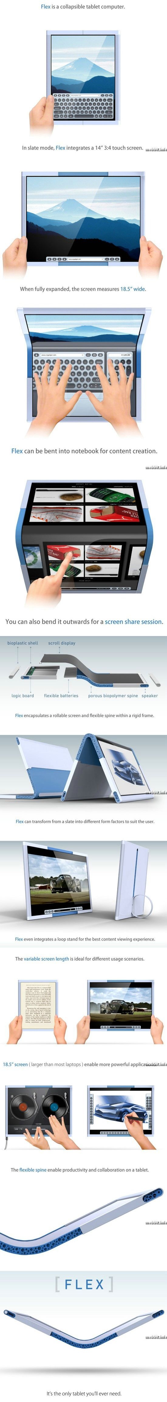 Концептуальное устройство Flex – это планшет и ноутбук в одном. Базовый формат Flex – 14-дюймовый (!) планшет с сенсорным экраном 3:4. Благодаря гибкому дисплею вы можете раздвинуть этот планшет в 18,5-дюймовый широкоформатный девайс. А затем, если понадобится, согнуть, придав ему форму ноутбука. Корпус Flex сделан из биополимерного пористого материала, одновременно и эластичного, и прочного. Батареи также гибкие. Обратная сторона снабжена кольцевой выдвижной подставкой. Увы, Flex – всего лишь концепт.