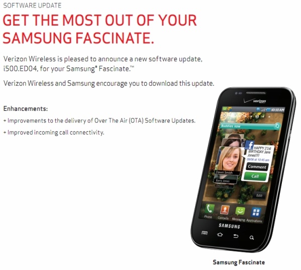 В связи с этим компания Samsung сообщает о выпуске обновления, которое направлено на улучшение стабильности соединения и удержания входящего вызова. Пока никаких комментариев относительно апгрейда не поступало, поэтому каждый владелец Samsung Fascinate может сам решать вопрос об необходимости провести апгрейд, но системное сообщение о наличии новой версии программного обеспечения должно придти.