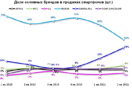полугодии 2011 года на смартфоны пришлось 46%, в то время как в 2010