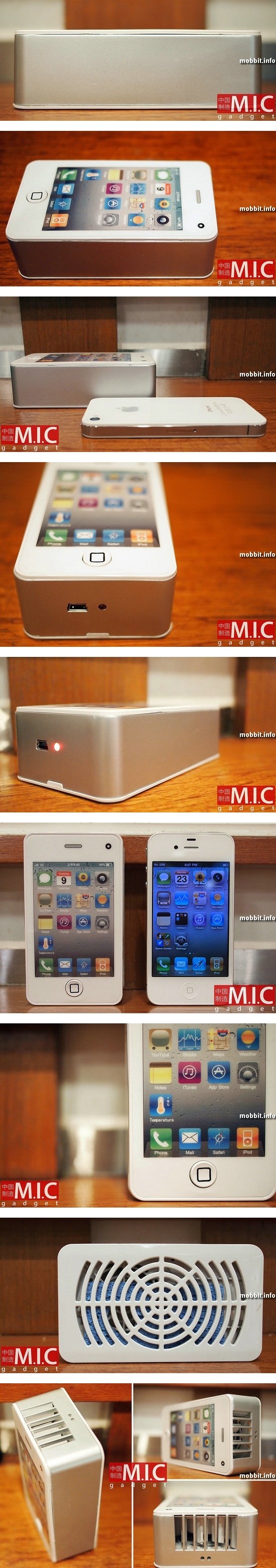 Думаете, все производители мобильных телефонов стремятся выпускать максимально тонкие аппараты? Ошибаетесь: вот этот китайский iPhone 4 имеет в толщину целых 30 мм! Впрочем, это, конечно, шутка: девайс на фото – не телефон вовсе, а… китайский портативный вентилятор! Надо отдать устройству должное, оно весьма искусно прикидывается «яблочным» смартфоном: чего стоит один пластик, выглядящий алюминием, или лицевая панель, имитирующая стартовый экран iPhone. Впрочем, на этом сходство заканчивается. Кнопка Home отвечает здесь за включение-выключение прибора. На нижней панели располагаются порт miniUSB и световой индикатор состояния девайса. На верхней и задней панелях находятся вентиляционные отверстия. Кстати, чтобы выдуваемый воздух оставался прохладным, пользователю предлагается периодически снимать заднюю панель и смачивать находящуюся под ней губку :) Устройство работает на литиево-ионной батарее. Купить новинку можно всего за 10 долларов. Видео далее.