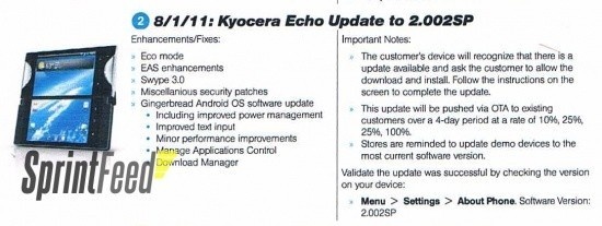 Появилась информация о том, что смартфон Kyocera Echo стает обладателем Gingerbread в самом начале августа. В дополнение к новой операционной системе трубка получит SWYPE 3.0, оптимизированный менеджер загрузок и усовершенствованную систему безопасности.