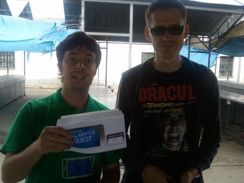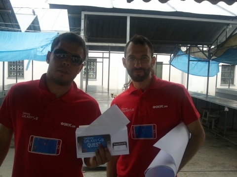 Третій день квесту у розпалі: Завдання №1, №2 та №3Команди розпочали день із двох фотозавдань. ![]() Завдання №2 - В поемі, яка починається такими рядками "Минають дні, минає літо, А Україна знай горить," необхідно знайти прізвище відомого козака та знайти пам`ятник цьому персонажу. Необхідно зробити фото всієї команди біля пам`ятника Івану Гонті, в руках у команди повинен бути плакат із зображенням команди, її назви та зі смартфоном Samsung Galaxy S II. ![]() Результати перших двох фотозавдань команди розмістили у своїх щоденниках: Завдання №3 - На ринку в м.Умань необхідно знайти агента в фартуці продавця, який стоїть за прилавком з табличкою "Android маркет безкоштовно". Командам необхідно обміняти фото козака Гонти з попереднього фотозавдання на програму для зчитування QR кодів. ![]() ![]() ![]() Першими програму для QR кодів отримали Інгаджет, другими були Dance girls, третіми "прокачали" свій смартфон MTVj`s, останніми були Расфокус. А також відеощоденник першого дня квесту: