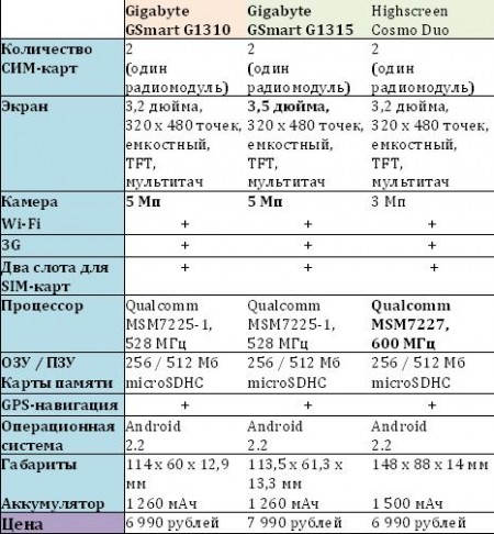 Сравнение Gigabyte GSmart G1310 с другими «двухсимочными» Android-смартфонами:
