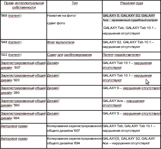 Суд установил, что устройства Samsung GALAXY Tab не нарушают прав интеллектуальной собственности. В его постановлении указывается, что относительно устройств GALAXY S, GALAXY S II и GALAXY Ace зафиксировано всего лишь одно нарушение прав интеллектуальной собственности из десяти, упомянутых в судебном иске.