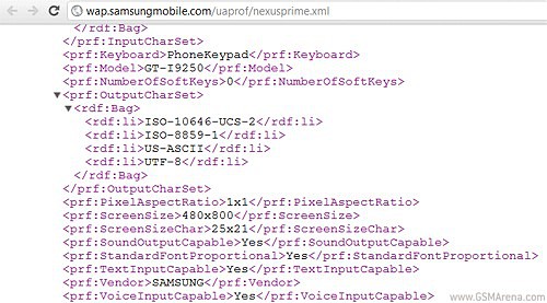 На сайте Samsung в одном из профилей была замечена информация о готовящемся к выходу смартфоне Samsung Nexus Prime. Модельный номер девайса — I9250. Аппарат получит экран с разрешением 480 x 800 пикселей (WVGA). Напомним, что ранее предполагалось, что разрешение экрана новинки составит 720p как у Galaxy Note.