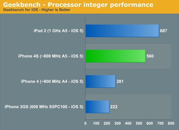 В тесте процессоров Geekbench новый iPhone набрал 683 балла против 360 баллов у iPhone 4 и 266 баллов у iPhone 3GS.