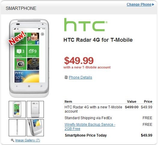 Если Вы задумались о приобретении смартфона HTC Radar, то портал Wirefly.com рад предложить его за 49,99 долларов с учетом двухлетнего контракта с T-Mobile.