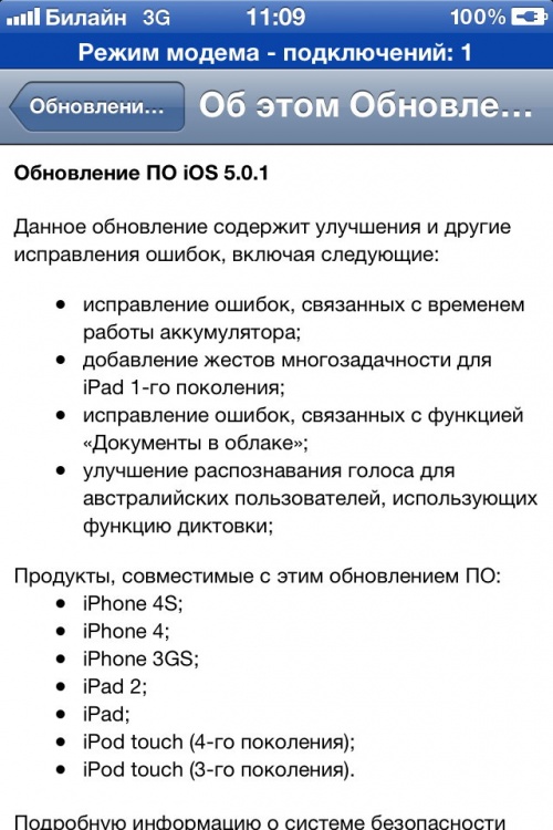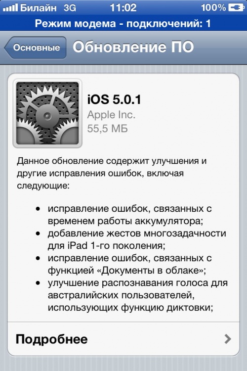 Компания Apple довольно-таки оперативно выпустила обновление iOS 5.0.1, исправляющее ошибки, которые связаны со временем работы аккумуляторной батареи iPhone 4 и iPhone 4S. Кроме того, апдейт добавляет жесты многозадачности для первого iPad, улучшает функцию «Документы в облаке» и улучшает распознавание голоса для пользователей из Австралии.