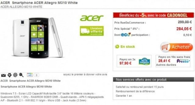 Смартфон Acer Allegro под управлением Windows Phone 7.5 теперь можно приобрести в интернет-магазине RueDuCommerce.fr (Франция), стоимостью 284 евро, при наличии двух цветов корпуса – синий и черный.