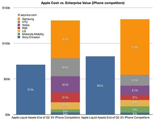 Apple может купить всю мобильную промышленность за исключением SamsungВозможно, вы уже слышали о том, что в распоряжении Apple имеется около $82 миллиардов наличных средств. А недавно аналитик Asymco Гораций Дедью (Horace Dediu) попытался выяснить, сможет ли Apple купить всю мобильную промышленность. И ответ на этот вопрос оказался однозначен – «нет». Денег Apple не хватит для того, чтобы приобрести всех ключевых игроков рынка. Причем всю «малину» компании из Купертино испортил ее давний соперник - Samsung. ![]()