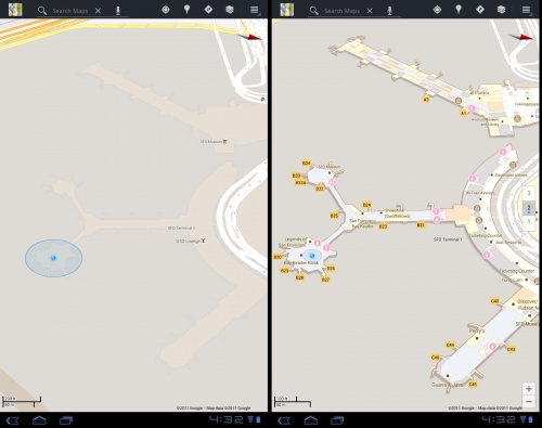 Новая версия Google Maps появилась на Android Market, особенностью которой стало появление "внутренних карт" для самых популярных городов, их улиц, кафе, ресторанов, аэропортов и многого другого. Так что теперь появилась возможность, находясь внутри того или иного крупного объекта, например в Ikea, воспользоваться навигацией именно по нему, что особо удобно при посещении незнакомых мест, в том числе и аэропортов.