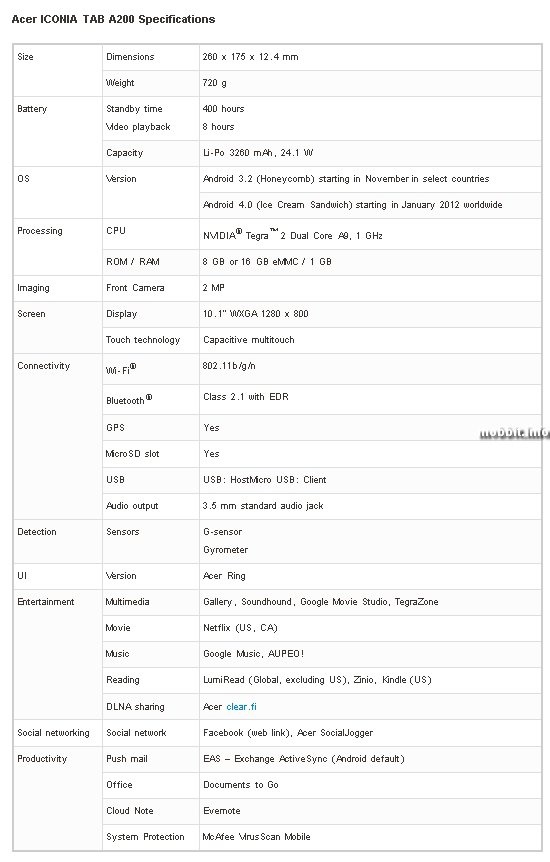 Acer официально анонсировала новый планшет на базе Ice Cream Sandwich: Iconia Tab A200. Модель обладает 10,1-дюймовым Multitouch-дисплеем с разрешением 1280 х 800, двухъядерным процессором NVIDIA Tegra 2 (1 ГГц), 1 ГБ RAM, 2 Мп фронтальной камерой, интерфейсом USB, MicroSD-картридером. Устройство поставляется с рядом предустановленных приложений, включая многозадачного менеджера Acer Ring, программу Screenshot и т.д. В ряде стран уже можно приобрести Iconia Tab A200 на базе Android Honeycomb. Версия на основе Ice Cream Sandwich выйдет в январе 2012 года – тогда же у пользователей, купивших планшет до Нового года, появится возможность бесплатно обновить ОС до Android 4.0. Цена новинки пока неизвестна. Видео, а также полный список характеристик девайса далее.