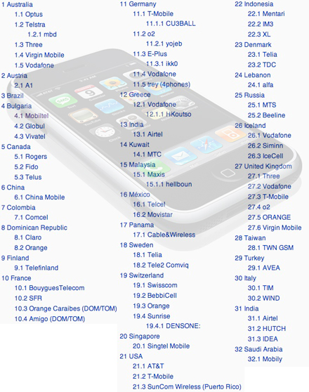 Программная разлочка iPhone работает более чем в 42 странах!Официального выхода iPhone в Европе и Азии придется ждать еще несколько месяцев, но разве остановит это тех, кто хочет пользоваться новейшим телефоном уже сейчас? Судя по списку, составленному iPhone Dev Team, программная разлочка iPhone уже проверена и работает более чем в 40 странах. Точнее, по данным самой команды, стран было 32, но подключились читатели, и за несколько часов список пополнился еще более чем десятком стран и операторов.