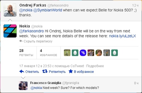 Nokia Belle выйдет на следующей неделеЭто следует из комментария Nokia на официальном Twitter-канале. Пока непонятно, для каких смартфонов выйдет обновление. Ранее компания собиралась выпустить апдейт в феврале для моделей Nokia 500, N8, E7, E6, X7, C6-01, C7 и Oro. Nokia Belle предложит шесть рабочих столов, новые виджеты и приложения, удобное главное меню и многое другое.