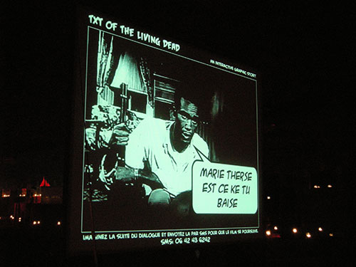 Ночь живых SMS-мертвецовПредставьте себе большой 15-футовый уличный экран, на котором идет легендарный фильм "Ночь живых мертвецов". А теперь уберите из фильма звуковой ряд и добавьте к нему субтитры, которые с помощью SMS-сообщений могут писать сами люди!