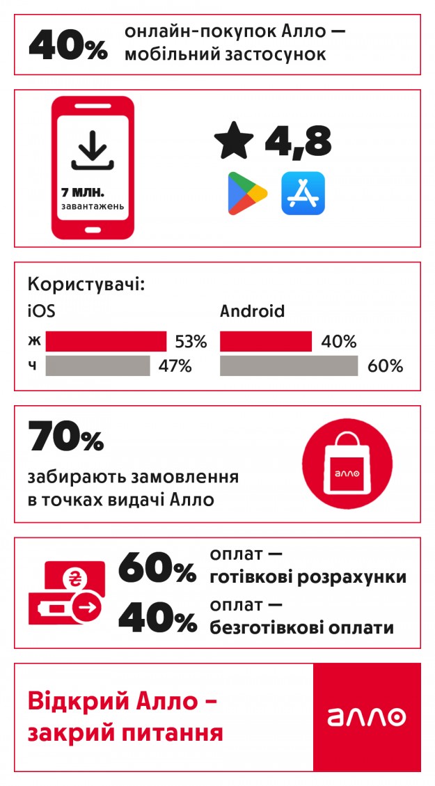 Частка онлайн-продажів на маркетплейсі Алло зростає рік до року завдяки популярності мобільного застосунку. На кінець 2024 року 40% всіх онлайн-покупок на маркетплейсі припали саме на нього. Загалом користувачі завантажили застосунок Алло понад 7 мільйонів разів, залишивши схвальні відгуки і оцінивши його в App Store та Google Play на 4,8 балів. Активно купують у застосунку користувачі у віці до 45 років, проте збільшується кількість прихильників мобільного шопінгу у віці 50+. Клієнти від 18 до 34 років – основні покупці в iOS-версії застосунку, їх частка становить 60%, ще 20% припадає на користувачів у віці 35-44 років, ще 20% – старші за 45. Серед користувачів Android-версії застосунку Алло 30% становлять покупці віком 35-44 роки, по 20% – у вікових категорій 25-34 та 45-54 роки. Доля жіночої аудиторії iOS-версії застосунку зросла та становить 53%. Доля користувачок пристроїв на базі Android не змінилася і залишається на рівні 40%. Топ міст перебування покупців – Київ, Дніпро, Львів, Харків, Одеса.
