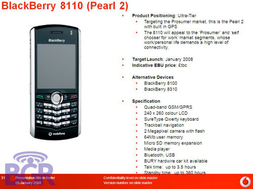Два BlackBerry от VodafoneПод маркой Vodafone в этом году выйдут сразу два телефона BlackBerry - BlackBerry 8110 (Pearl 2) и BlackBerry 8xxx . Фото дивайса под номером 8110, так же как и в случае с другими анонсированными устройствами, которые выйдут под маркой Vodafone, сопровождаетcя еще и техническим описанием. Аппарат по функционалу ничем не выделяется. Известно, что эта модель будет оснащена GPS-модулем и, что Wi-Fi в этом смартфоне нет. Pearl 2 будет представлен уже в этом месяце. ![]() Следующая «ягодка», информация о которой подробно изложена в том же самом документе, имеет условный номер 8xxx. На фоне BlackBerry 8110 оснащенность этого смартфона впечатляет: GPS, Wi-Fi, USB, дисплей 480 x 320 точек, QWERTY-клавиатура, аккумулятор емкостью 1500 мАч, 2-мегапиксельная камера. Его выход ожидается в мае. ![]() Джерело: mobiset.ru Обговорення новиниКоментариев пока никто не оставил. Станьте первым! Попередні новини
