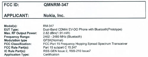 Благодаря специальному ходатайству Nokia, на сайте FCC о телефоне нет практически никакой информации. Известно лишь, что он поддерживает Bluetooth и работает в сетях CDMA/EV-DO. Название модели — RM-347.