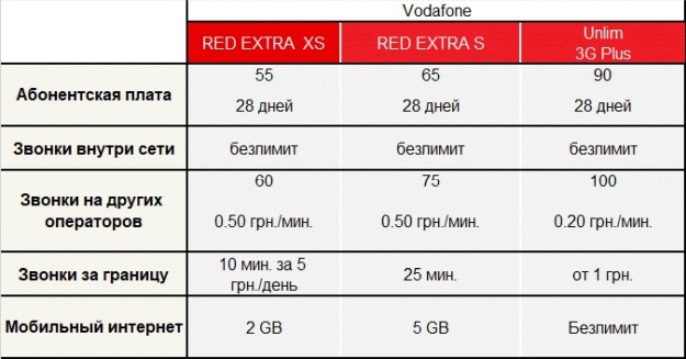 Самым оптимальным тарифом у Киевстар можно считать «Безлим Социальные сети». 3 ГБ данных за 75 гривен получится уверенно растянуть на 28 дней. Ведь если сравнить с «Безлим Разговоры», то клиент получает не 18 МБ/день, а 108 МБ/день и час на звонки на других операторов. Так, что минимальный тариф в 55 грн по факту будет интересен только тем, кто делает звонки исключительно внутри сети оператора. VodafoneПереходим к Vodafone. Возможно, в виду западного происхождения бренда и понимания реальных запросов клиентов, специалисты, разрабатывающие тарифную сетку, даже в самом доступном пакете за 55 грн предлагают 2 ГБ трафика в месяц и 60 минут звонков по Украине. Этого уже достаточно, учитывая бесплатный доступ к социальным сетям. Но все же, учитывая возросшие скорости 4G, самым оптимальным у Vodafone выглядит «срединий» тариф – Red Extra S. Если сравнить его с упомянутым выше «Безлим Социальные сети» от Киевстар, получим такой расклад: внутрисеть - безлимит у обоих операторов, минуты на другие сети: 60 - у Киевстар, 75 - у Vodafone. Также Vodafone дает 25 минут международных звонков, которые включены в стоимость тарифа. Ну и главное – интернет. Получаем: 3 ГБ у Киевстар плюс безлимитные соцсети, 5 ГБ у Vodafone плюс безлимитные соцсети. Также Vodafone дает безлимитный YouTube на 6 месяцев. При этом абонентская плата: Киевстар - 75 грн/28 дней, Водафон - 65 грн/28 дней. То есть, тариф Vodafone дешевле, при этом наполнение значительно больше и позволяет удовлетворить все потребности абонента, включая международные звонки и просмотр видеороликов.