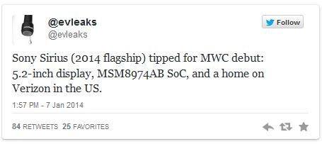5.2-дюймовый флагман Sony Sirius дебютирует на MWC 2014Известный своими публикациями о неанонсированных устройствах twitter-аккаунт @evleaks сообщил, что новый флагман компании Sony с кодовым названием Sirius будет представлен на выставке MWC 2014 в Барселоне в конце февраля.