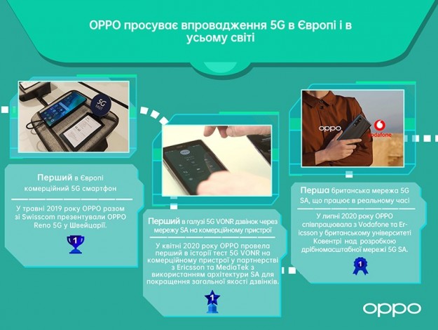 Первый коммерческий 5G-смартфон в Европе: OPPO Reno 5G OPPO заняла первое место по глобальному коммерческому использованию 5G как для сетей NSA (Non-Standalone), так и для SA (Standalone). В мае 2019 года компания вместе с партнером Swisscom презентовала в Швейцарии смартфон ОРРО Reno 5G. Таким образом, в Европе появился доступный коммерческий 5G-смартфон.