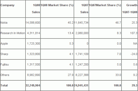 Отчёт Gartner: 32 миллиона смартфонов за один кварталАналитическая компания Gartner опубликовала отчёт о своём плановом исследовании рынка смартфонов. Главная мысль отчёта: в первом квартале 2008 года во всём мире было продано более 32,2 миллиона смартфонов различных моделей и производителей. Из них 11,7 миллионов пришлось на регион EMEA (Европа, Средний Восток и Африка) и 7,3 миллиона на Северную Америку, где продажи выросли на 106,2% по сравнению с аналогичным периодом прошлого года.