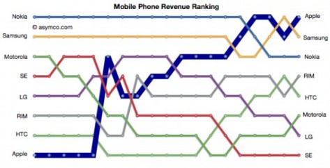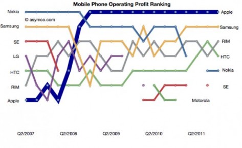 В четвертом квартале 2011 года Samsung показал второй результат, аккумулировав прибыль рынка мобильных телефонов в размере 16%. Остальные 9% распределились следующим образом: Research in Motion 3.7%, HTC 3.0% и Nokia 1.8%. 0,5% пришлось на, так называемых, “других”.