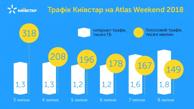 Абоненты Киевстар использовали больше 9 тысяч гигабайт данных на Atlas Weekend 2018В сравнении с прошлым годом, трафик мобильного интернета вырос втрое. Также за 6 дней фестиваля абоненты использовали практически 1,5 миллиона минут голосовой связи.