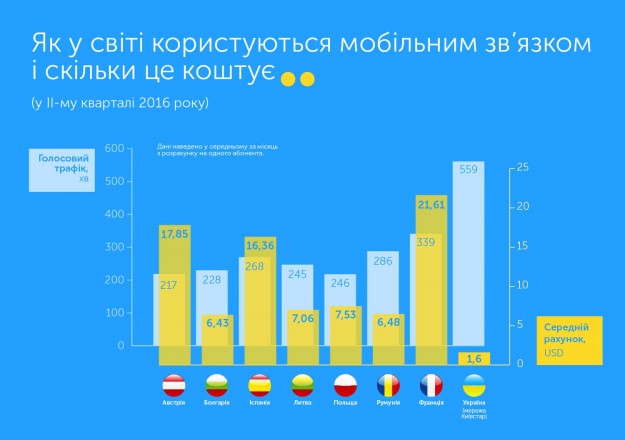 Абоненты Киевстар используют вдвое больше голосового трафика, чем жители стран ЕСВо втором квартале 2016 года абоненты Киевстар говорили в среднем по 559 минут в месяц, что на 5% больше, чем в аналогичном периоде 2015 года. Согласно данных GSMА Intelligence, в странах ЕС показатель MoU составляет 228 минут. При этом затраты европейских абонентов на телеком услуги (ARPU) в среднем 417 грн ($16,2) в месяц. Тогда как в Киевстар этот показатель во 2-м квартале 2016 составил 44 грн ($1,6). Таким образом, используя вдвое больше голосового трафика, чем жители стран ЕС, абоненты Киевстар расходуют на связь почти в десять раз меньше.