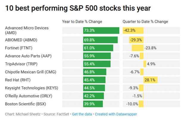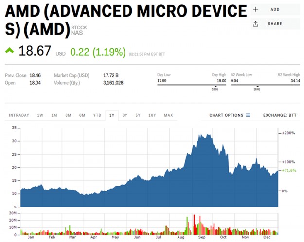 Акции AMD стали лучшим активом 2018 года среди 500 крупнейших компанийМы недавно писали, что из-за 54-процентного падения в четвёртом квартале акции NVIDIA стали наихудшим активом для инвестиций из списка S&P 500 — базового фондового индекса, в корзину которого включено 500 избранных акционерных компаний США с наибольшей капитализацией. В противоположность им акции компании AMD, хотя они тоже заметно просели в цене за последние несколько месяцев, на более долгосрочном интервале времени оказались вполне прибыльным активом. И даже более того, если смотреть на годовую динамику, то цена AMD выросла на 73 %, и это позволяет назвать её акции наиболее выгодными ценными бумагами по итогам 2018 года из всего списка S&P 500.