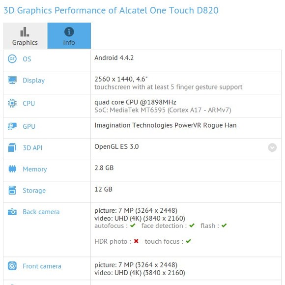ALCATEL ONETOUCH D820 с QHD-дисплеем "засветился" в бенчмаркеВ базе данных популярного бенчмарка GFXBench был замечен не представленный еще официально смартфон ALCATEL ONETOUCH D820. Согласно тестеру, новинка оснащена 4.6-дюймовым дисплеем с разрешением 2560x1440 пикселей, 8-ядерным процессором MediaTek MT6595 с тактовой частотой 2.2 ГГц, 3 ГБ оперативной памяти и 16 ГБ встроенной, поддержкой высокоскоростных 4G LTE-сетей, а также двумя 8Мп камерами с возможностью записи 4К-видео.