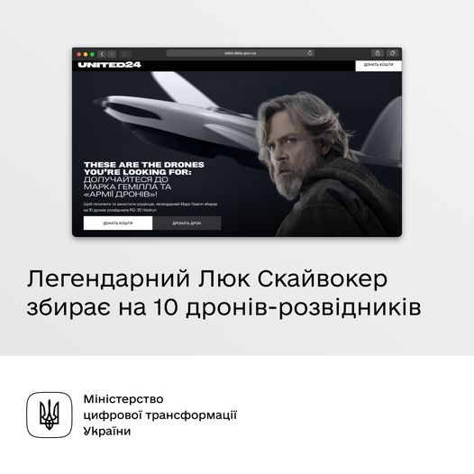 Амбасадор United24, легендарний Марк Гемілл запустив збір на 10 дронів-розвідників RQ-35 Heidrun для ЗСУRQ-35 Heidrun — це безпілотник датського виробництва з дальністю польоту 25 кілометрів, який може передавати відеозображення в режимі реального часу. Це дозволить отримувати розвіддані, не наражаючи оператора на небезпеку. Надійна радіосистема RQ-35 Heidrun здатна протистояти РЕБ. Збір здійснюється за запитом Генерального штабу ЗСУ. 25 таких дронів ще навесні доставили на передову, де вони вже показали свою ефективність. 10 нових безпілотників суттєво розширять розвідувальний потенціал ЗСУ та допоможуть врятувати тисячі життів.