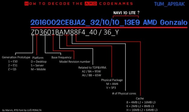 Пользователь с псевдонимом Tum Apisak, являющийся известным источником утечек, которые зачастую подтверждаются, опубликовал кодовое обозначение инженерного образца нового гибридного процессора AMD Gonzalo — 2G16002CE8JA2_32 / 10 / 10_13E9. Высока вероятность, что финальная версия данного чипа и станет основой для консолей нового поколения. А зная схему, по которой AMD создаёт кодовые обозначения для своих процессоров, можно расшифровать данное кодовое название и выяснить основные характеристики этого инженерного образца.
