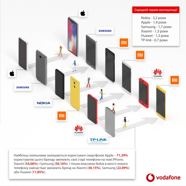 Зато владельцы Nokia реже других меняют свои телефоны на новые. Аппарат производства Nokia «живет» в сети 3 года. Почти 2 года пользуются купленными трубками владельцы iPhone и Samsung. Чаще других меняют трубки поклонники китайских брендов – их владельцы покупают себе новый смартфон через 15-16 месяцев. Аналитики Vodafone Retail отмечают региональные особенности украинского рынка смартфонов. Так, постоянством отличаются поклонники Samsung в Закарпатской, Кировоградской, Полтавской, Харьковской, Херсонской областях, а жители Донецкой и Хмельницкой областей неизменно выбирают Xiaomi.