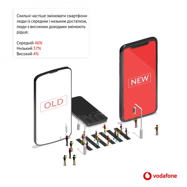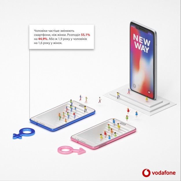 Мужчины чаще меняют смарфтоны, чем женщины. Люди со средним и низким достатком более склонны к покупке нового смартфона, чем их состоятельные соотечественники. Любимый цвет смартфона в Украине – черный (44,4%), за ним следуют синие (22,9%), серые (11,0%) и золотые (8,2%) смартфоны. Украинцы часто уходят из магазинов Vodafone не только со смартфонами. К каждому третьему смартфону докупается карта памяти, к каждому 18 смартфону – фитнес браслет. Покупатели редко выбирают оригинальные гаджеты к новому смартфону, больше отдают предпочтение бренду, функциональности, цене и пр. Единственное исключение – смартфоны Xiaomi, покупка которых чаще всего сопровождается приобретением фитнес-браслета этого же производителя.