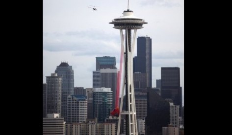 Несколько дней назад на “Космической башне” в Сиэтле появилось необычное существо, исказившее привычный пейзаж территории выставочного комплекса Seattle Center. Оно было круглое, красное, злое, и ... готовилось к полету в космос.
