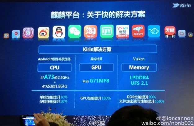 Он является улучшенной версией SoC Kirin 950 и 955. Его ядра сгруппированы в два кластера: квартет Cortex-A73 с частотой до 2.4 ГГц и квартет Cortex-A53 с частотой до 1.8 ГГц. За графику отвечает Mali-G71 MP8 GPU. По словам производителя, в сравнении с Kirin 950 SoC представленный сегодня чипсет является на 15% производительнее и на 20% энергоэффективнее. В графике производительность выросла на 180%.