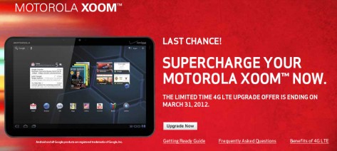 Апгрейд Motorola XOOM до 4G продлится до 31 мартаПользователи Motorola XOOM по-прежнему использующие 3G должны поторопиться, так как обновление планшетника до 4G LTE окончится 31 марта. Но перед тем как произвести апгрейд Motorola XOOM, необходимо выполнить ряд требований. Это скопировать на сторонний носитель все имеющиеся контакты, контент, учетные записи и прочее. После этого можно нести свой Motorola XOOM в сервисный центр, где его сделают обладателем 4G.