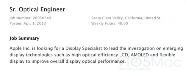 Apple изучает возможности использования гибких дисплеевБлагодаря огромному количеству заявок, поданных Apple в Бюро по регистрации патентов и торговых марок США, всем уже давно известно, что компания занимается изучением возможностей использования гибких дисплеев в своих мобильных устройствах. А сегодня компания разместила вакансию на должность старшего инженера по оптическим технологиям, чем еще раз намекнула на свою заинтересованность в данном вопросе. Согласно требованиям компании, кандидат должен иметь опыт работы в сфере дизайна и разработки дисплейных технологий, способности к проектированию LCD и OLED панелей. Также необходимо знать все плюсы и минусы конструкции, рабочего процесса и возможностей применения гибких дисплеев в устройствах.