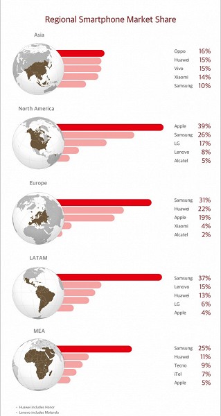 Apple лидирует на американском рынке смартфонов, Samsung — в Европе, Африке и Латинской Америке, а Oppo — в Азии