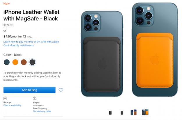 Кошелёк MagSafe Wallet оценивается Apple в $59. Он крепится к задней части смартфона с помощью магнитной конструкции, предназначенной для позиционирования новых зарядных устройств с MagSafe. Аксессуар имеет достаточно скромные размеры и вмещает лишь парочку пластиковых карт. Практичность кошелька остаётся под вопросом. Он крепится к смартфону только при помощи магнитов, что создаёт риск того, что аксессуар может отсоединиться и потеряться со всем содержимым в тот момент, когда смартфон кладётся или вынимается из узкого кармана или сумки. Вместимость кошелька довольно скромная, да и для защиты устройства от механических воздействий он не подойдёт, поскольку прикрывает лишь немного больше половины задней панели iPhone. Кроме того, он препятствует работе с зарядными устройствами MagSafe, хотя его отсоединение от смартфона занимает не более секунды.
