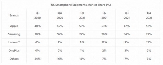 Четвёртый квартал компания завершила с долей 56%, что является лучшим результатом за 2021 год, хотя годом ранее Apple и вовсе заняла 65% рынка.