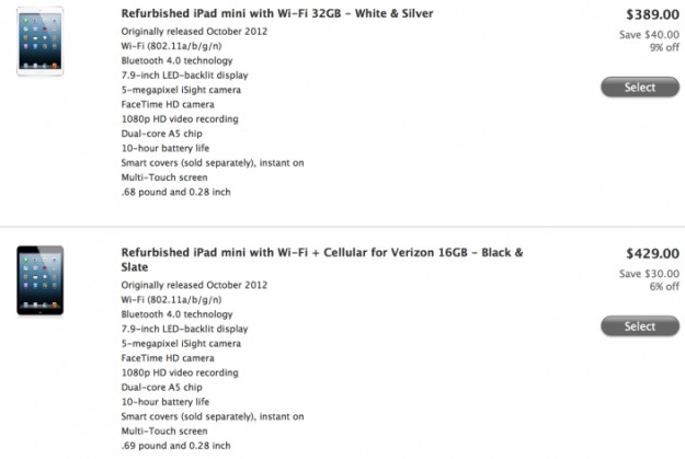 Apple представила обновленные iPad mini и iPad 4Компания Apple начала продажи обновленных версий своих последних моделей планшетов iPad —iPad mini и iPad четвертого поколения. В Apple Online Store теперь можно приобрести обновленную версию iPad mini с WiFi и с поддержкой Wi-Fi и сотовых сетей. Варианты обновленных моделей с разным объемом встроенной памяти пока ограничены. Так, в интернет-магазине Apple можно приобрести 32ГБ модель с Wi-Fi стоимостью $389, это на $40 дешевле, чем было ранее, и 16ГБ модель с поддержкой Wi-Fi и сотовых сетей за $429.
