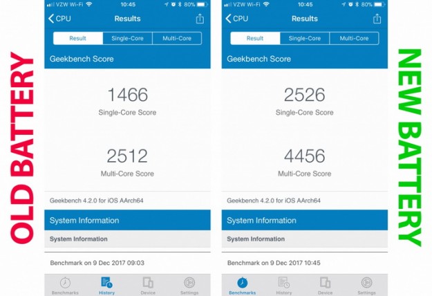 На просторах форумов Reddit появились любопытные сообщения о разительном отличии производительности iPhone с разной степенью изношенности батареи. Так, пользователи iPhone 6S сделали замеры в бенчмарке Geekbench до и после замены изношенного аккумулятора, которые оказались такими: 1466/2512 очков до замены и 2526/4456 баллов после. Похожие показатели наблюдались и в некоторых других случаях и на разных поколениях iPhone (до iPhone 7, с которым пришли энергоэффективные ядра). Связывают это с проблемами перезагрузки iPhone 6S, с которой столкнулось небольшое количество владельцев этого девайса. Тогда они были заменены, как бракованные, но в iOS 10.2.1 Apple якобы приняла меры, чтобы полностью исключить неправильный вольтаж, приводящий к перезагрузкам. Reddit рекомендует проверить рабочие частоты процессора приложением CpuDasherX, а для получения полной производительности iPhone следует заменить батарею в случае большого износа. Джерело: Mobiltelefon.Ru Обговорення новиниКоментариев пока никто не оставил. Станьте первым! Попередні новини