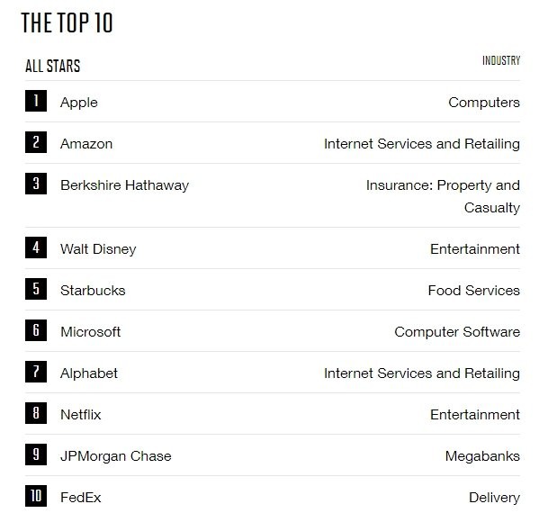 Как и предыдущие два года, на втором месте находится Amazon. А вот третье место, в прошлом году отданное компании Alphabet, в этом году заняла Berkshire Hathaway, а сама Alphabet опустилась сразу на седьмое. Также в первую десятку вошли Walt Disney, Starbucks, Microsoft, Netflix, JPMorgan Chase и FedEX. Джерело: iXBT.com Обговорення новиниКоментариев пока никто не оставил. Станьте первым! Попередні новини