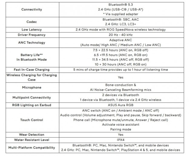 Для нової моделі навушників заявляється можливість під'єднання відразу до двох пристроїв за допомогою радіоканалу 2,4 ГГц, а також за протоколом Bluetooth. Якщо оригінальна модель ROG Cetra True Wireless пропонувала до 27 годин роботи разом із підзарядкою від чохла, то модель ROG Cetra True Wireless SpeedNova забезпечує до 47 годин роботи разом із чохлом у режимі Bluetooth. Щоправда, для цього доведеться вимкнути підсвічування і функцію шумозаглушення. В іншому разі новинка пропрацює до 26 годин. П'ять хвилин підзарядки забезпечать годину роботи навушників.