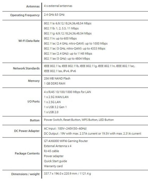 Производитель заявляет, что новинка обеспечивает скорость до 1148 Мбит/с в диапазоне 2,4 ГГц и 4804 Мбит/с в диапазоне 5 ГГц. Устройство оснащено двумя сетевыми потами со скоростью 2,5 Гбит/с, которые можно настроить как на приём, так и на передачу информации (WAN и LAN). Для увеличения эффективности роутер теоретически позволяет объединять 1- и 2-гигабитные порты в режиме WAN, достигая скорости 3,5 Гбит/с.