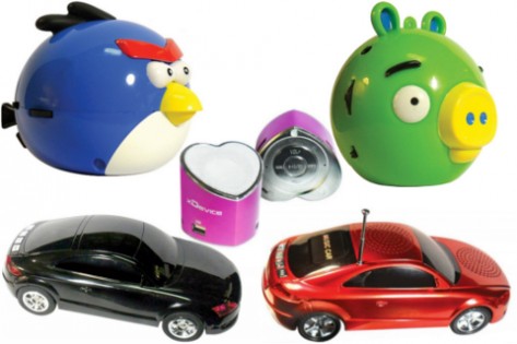 У современных смартфонов есть как неоспоримые преимущества, так и очевидные недостатки. Например, громкости стереофонических динамиков мобильного телефона Motorola E398 образца 2004 года хватало для того, чтобы обеспечить качественное громкое звучание музыки в комнате площадью до 15 квадратных метров. Современные же смартфоны в большинстве своем оснащаются значительно более тихими монофоническими динамиками – разработчики не имеют возможности оборудовать их мощными аудиосистемами из-за небольшой толщины устройств и наличия в их корпусах десятков электронных компонентов, отсутствовавших в устройствах середины 2000-х2. Следовательно, современные смартфоны малореально использовать в качестве карманного «бумбокса». Сегодня компания xDevice представляет линейку портативных аудиосистем MagicSound, которые при средних габаритах 70 х 50 х 50 мм и весе 100 г призваны заменить мобильные телефоны в роли карманных развлекательных центров для небольших компаний людей. Линейка MagicSound включает устройства в виде птиц из игры Angry Birds, робота – логотипа операционной системы Android, различных геометрических фигур, а также спортивных автомобилей и внедорожников (см. ниже).