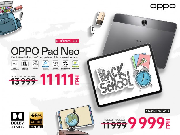 OPPO Watch X - Смартгодинник на Wear OS 4 із двоядерною архітектурою, має сапфірове скло та працює до 100 годин або 12 днів у екорежимі. Має GPS із подвійною частотою, автоматично розпізнає тренування, підтримує аналіз бігу та бадмінтону. Відстежує сон, пульс, стрес і SpO2, синхронізується з OPPO OHealth і Health Connect. Захищений за стандартами MIL-STD-810H, IP68 і 5ATM, підтримує швидку зарядку (повна за 60 хв). Інтегрований із Google Play, Assistant, Maps і Wallet. OPPO Watch X звичайна ціна 15999 грн. Акційна ціна 9999 грн (18/08-07/09). OPPO Pad Neo - Універсальний планшет із 11,4" екраном 90 Гц (7:5), чітким зображенням (2408x1720) і сертифікацією T?V Rheinland. Працює на Android 13 з процесором Helio G99. Має подвійні 8 Мп камери, якісний стереозвук та можливість розширення ОЗП до 16 ГБ. Акумулятор 8000 мАг підтримує швидку зарядку 33 Вт, що робить планшет зручним для роботи та розваг. ОРРО Pad Neo (8/128 Гб) LTE звичайна ціна 13999 грн. Акційна ціна 11111 грн (18/08-07/09).